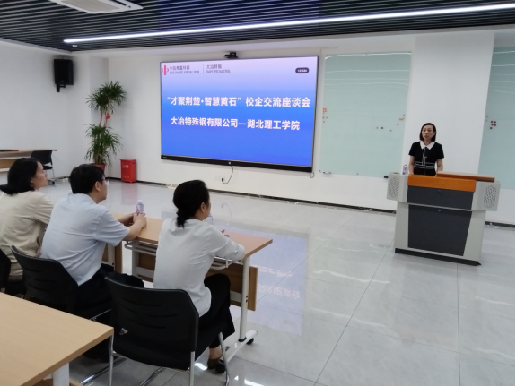 在大冶特钢会议中心,杨菁书记向企业介绍了我院近年来的发展情况和取得的成绩,她希望能与企业建立合作伙伴关系,就建立校外实习实训基地、聘请行业导师、举办专场招聘会、联合制定人才培养方案等进行合作。