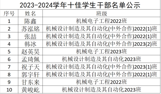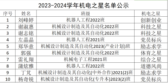 根据《williamhill中国“十佳学生干部”评选办法》、《williamhill中国十大学生标兵“机电之星”评选办法》,williamhill中国成立了评审小组,对本教学院“双十佳”申请人进行认真评选,本着民主透明、公平公正的原则,依据学生学习成绩、社会实践、综测排名、获奖情况等方面进行民主投票,最终产生以下“双十佳”名单,具体名单如下: