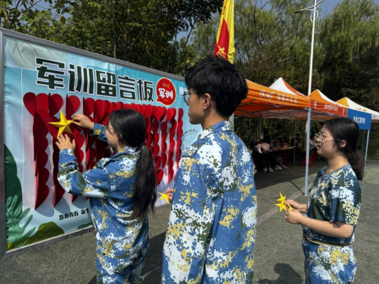 在军训留言板上,机电新生们纷纷粘贴上自己的军训感悟和心声。并用五角星贴纸和爱心贴纸张贴出五星红旗的形状,贴纸上写道:“军训虽苦,但让我学会了坚持和团结,这段经历将成为我人生中宝贵的财富。”“感谢教官的严格要求和悉心指导,让我们变得更加坚强。”“希望通过军训,我们能以更好的状态迎接大学生活,为自己的梦想努力奋斗。”