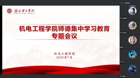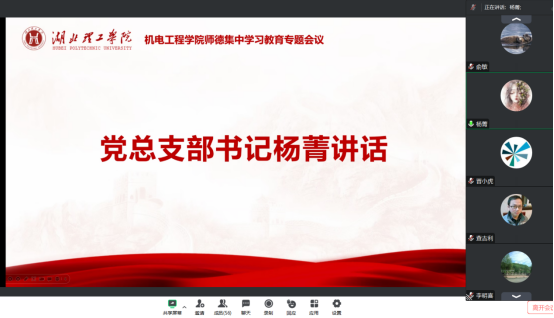 为深入学习贯彻习近平新时代中国特色社会主义思想,落实立德树人根本任务,进一步加强师德师风建设,积极营造风清气正的育人环境,williamhill中国于7月19日晚通过线上会议召开2023年师德集中学习教育专题会议,党总支书记杨菁、院长陶晶、副书记胡涛及学院全体教职工参会,会议由胡涛主持。