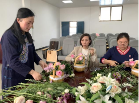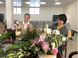 花是传递和平、美好、友谊的使者,在插花环节,大家在艺术学院殷海霞老师的指导下认真挑选花枝,研习花艺技法。插花是“无声的诗,立体的画”,娇艳欲滴的鲜花和苍翠可人的配叶在“女神”们的妙手中变成了一件件独一无二的插花作品,蕴含着她们对美的独到见解和对美好生活的向往追求。