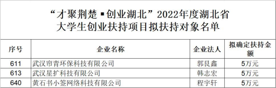 近日,由湖北省人力资源与社会保障厅、湖北省教育厅、共青团湖北省委员会共同发布的“才聚荆楚·创业湖北”2022年度湖北省大学生创业扶持项目拟扶持项目名单中,williamhill中国3名学生的创业项目入选,累计获创业扶持资金15万元。
