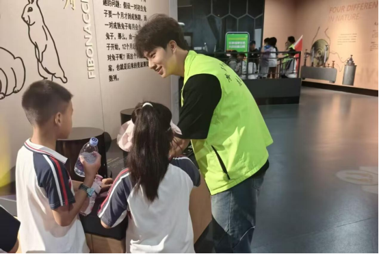 王宇健同学在小朋友们的簇拥中面对镜头:“我一直是一个内向的人,但是入馆参观的小朋友们眼里对于科学知识的渴望打动着我,我便化身成了‘无所不知’的大哥哥,我渐渐也变得自信起来了。小朋友们对科技知识的热情更感染了我,让我对于科技的发展有了更多的理解,对于专业知识的了解有了更多的热情。”